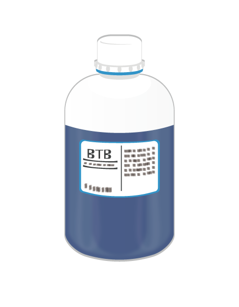 原液は試薬ビンに入った濃い青色の液体で、この原液は粉末のBTB(0.1~1g)を20mlのエタノール(90~95%)で溶かしてさらに純水で希釈し合計100mlにしたもの。