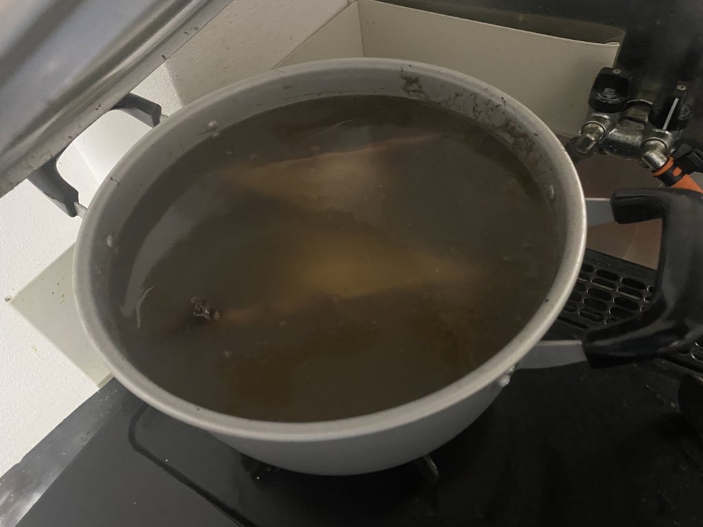 プラスチックのバケツにネット入りの骨を入れ、40度~50度くらいのお湯を注ぎます。