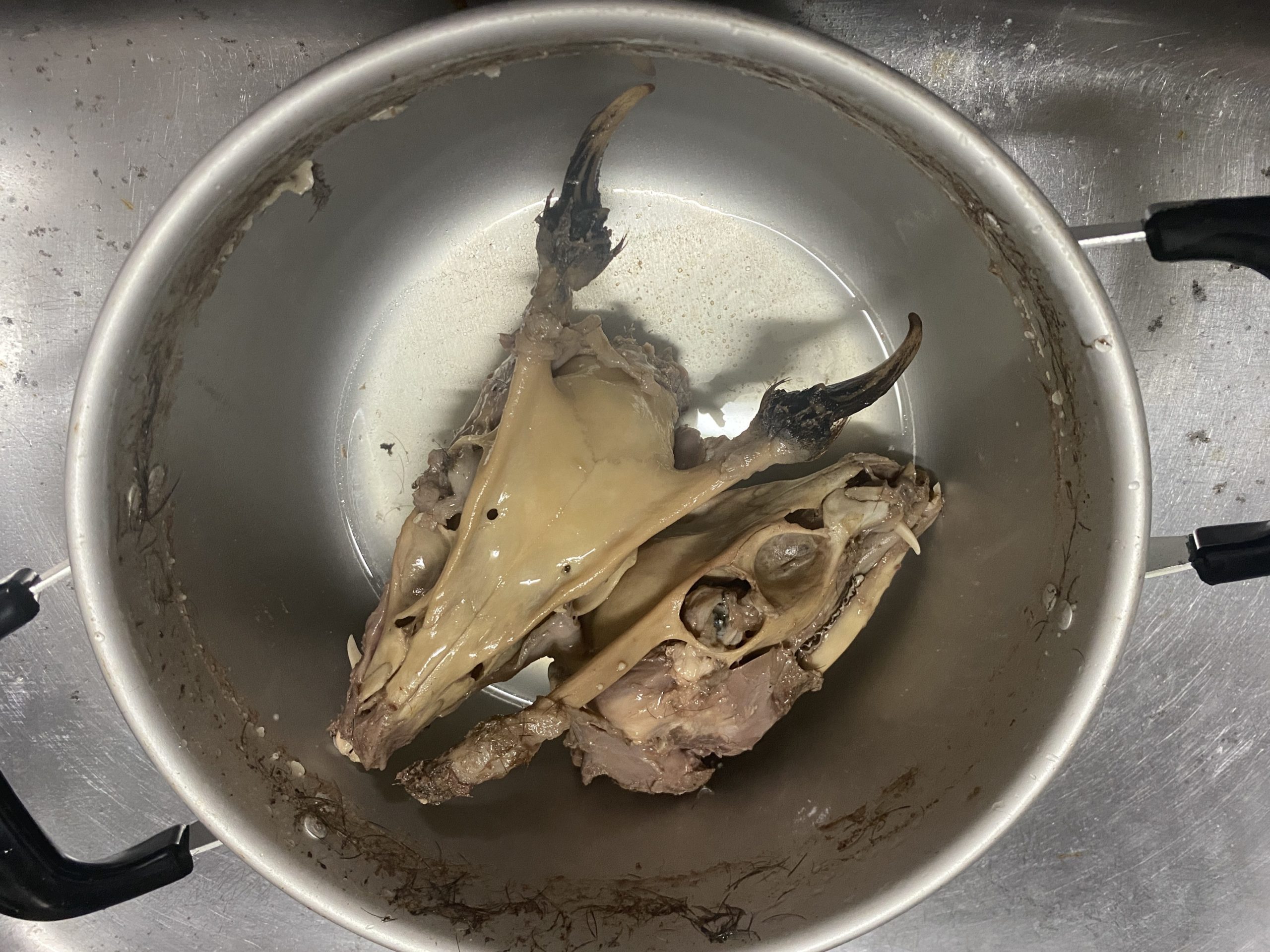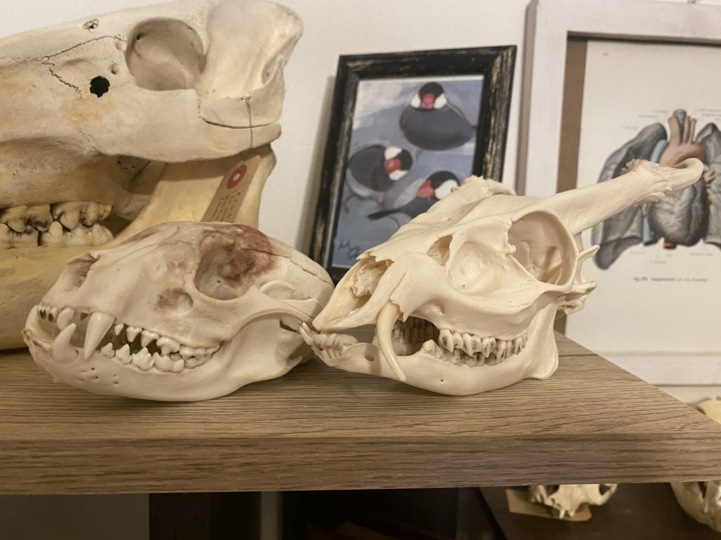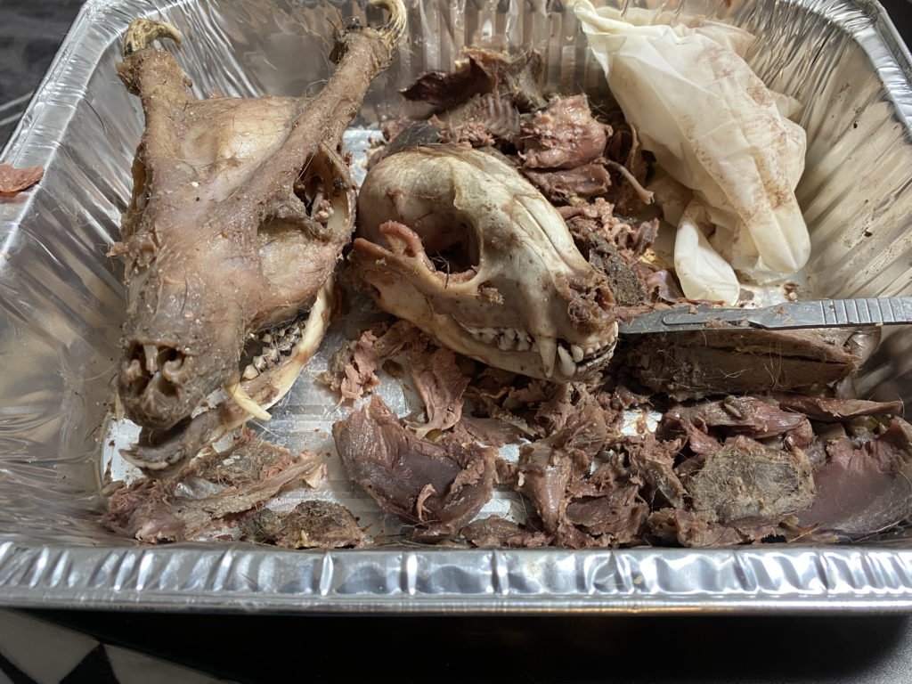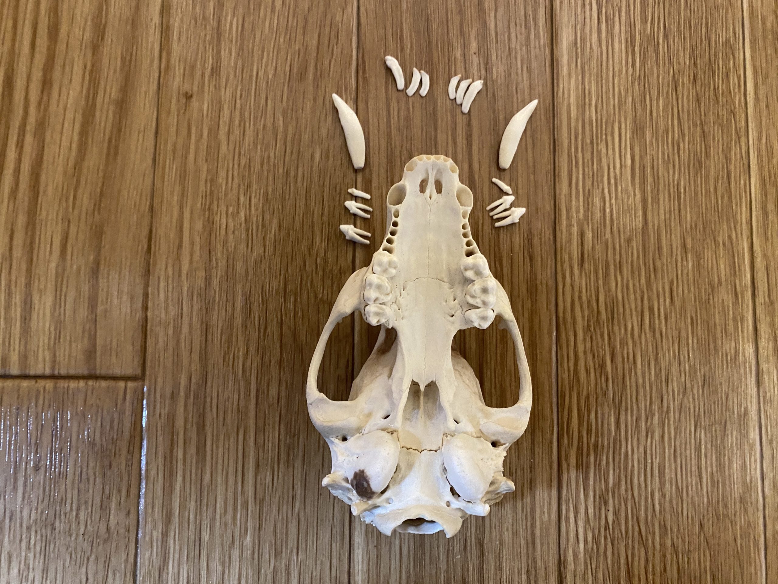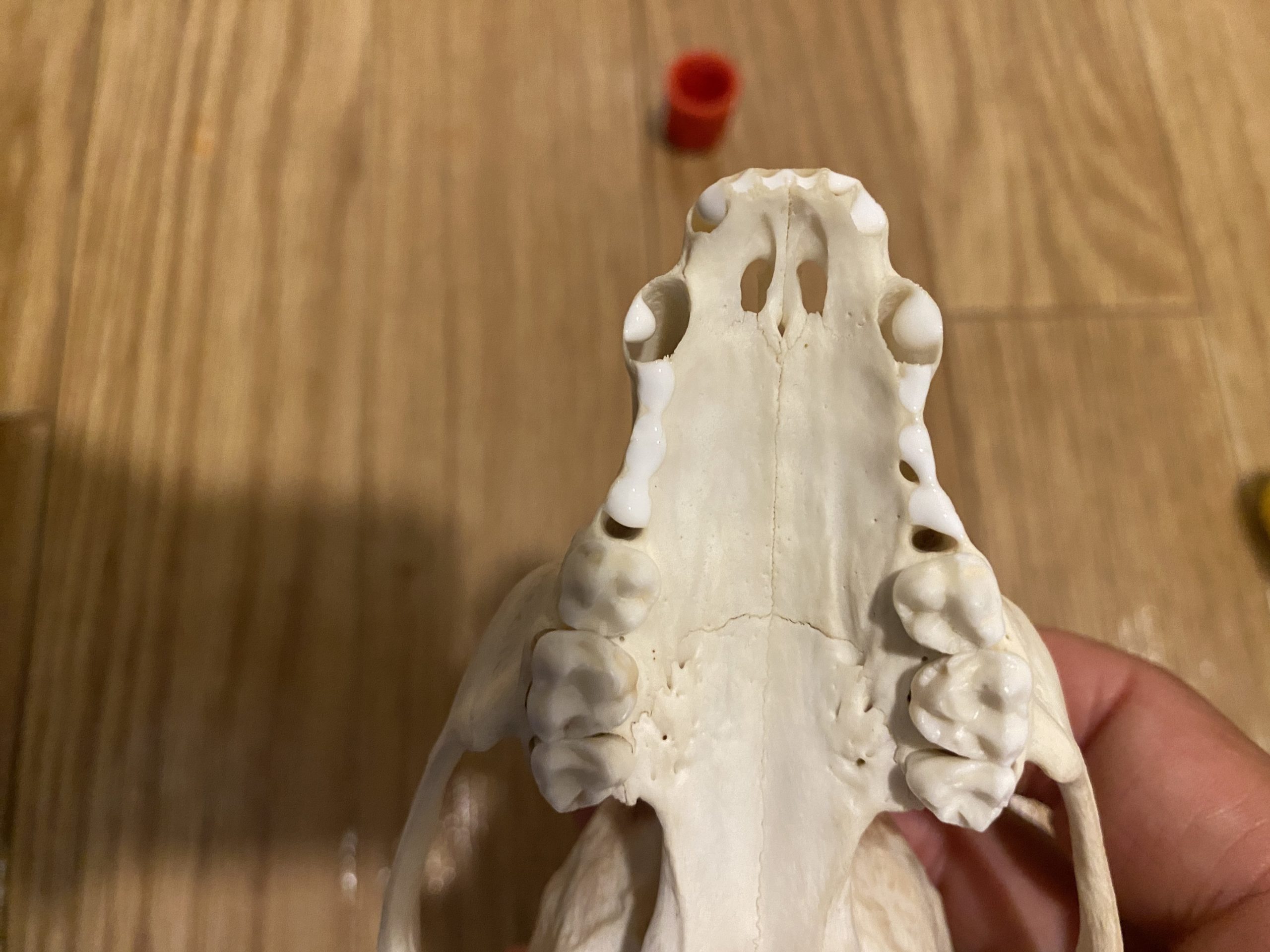 除肉が比較的簡単で、細かすぎる作業が少なく、歯をはめる場面で適度にパズルもできるうえ、何より完成品が骨!!って感じ強くてモチベも上がるので、頭骨での骨格標本作製は初心者の方非常におすすめです。