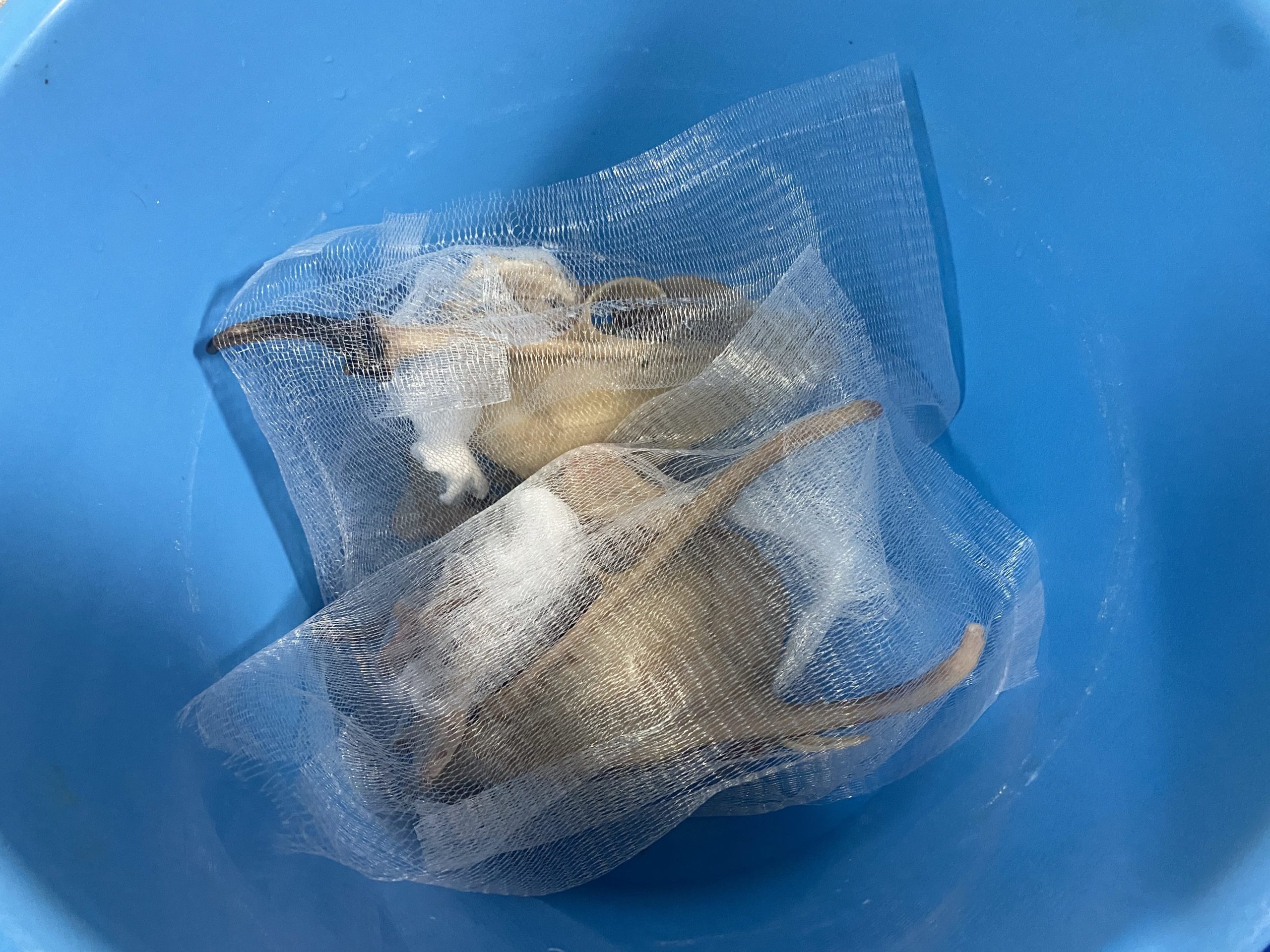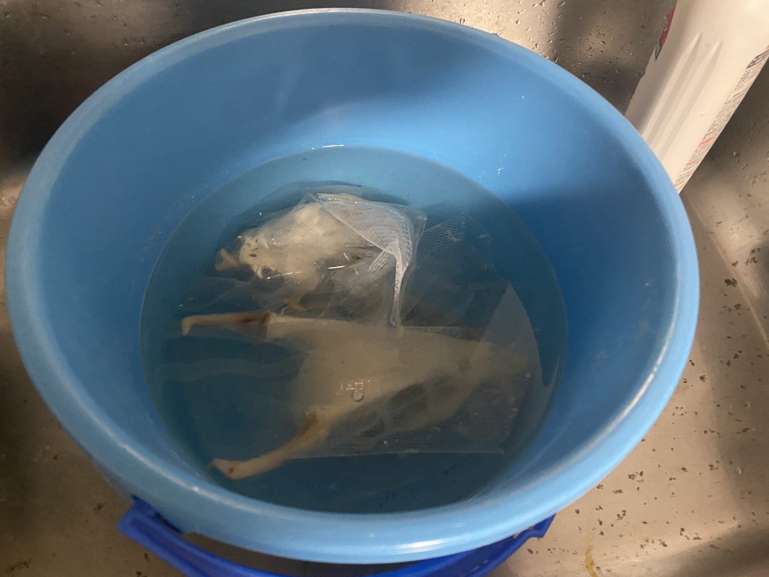 流し終わったら、再びネットで骨を包んで数日~数カ月水に漬けておきます。