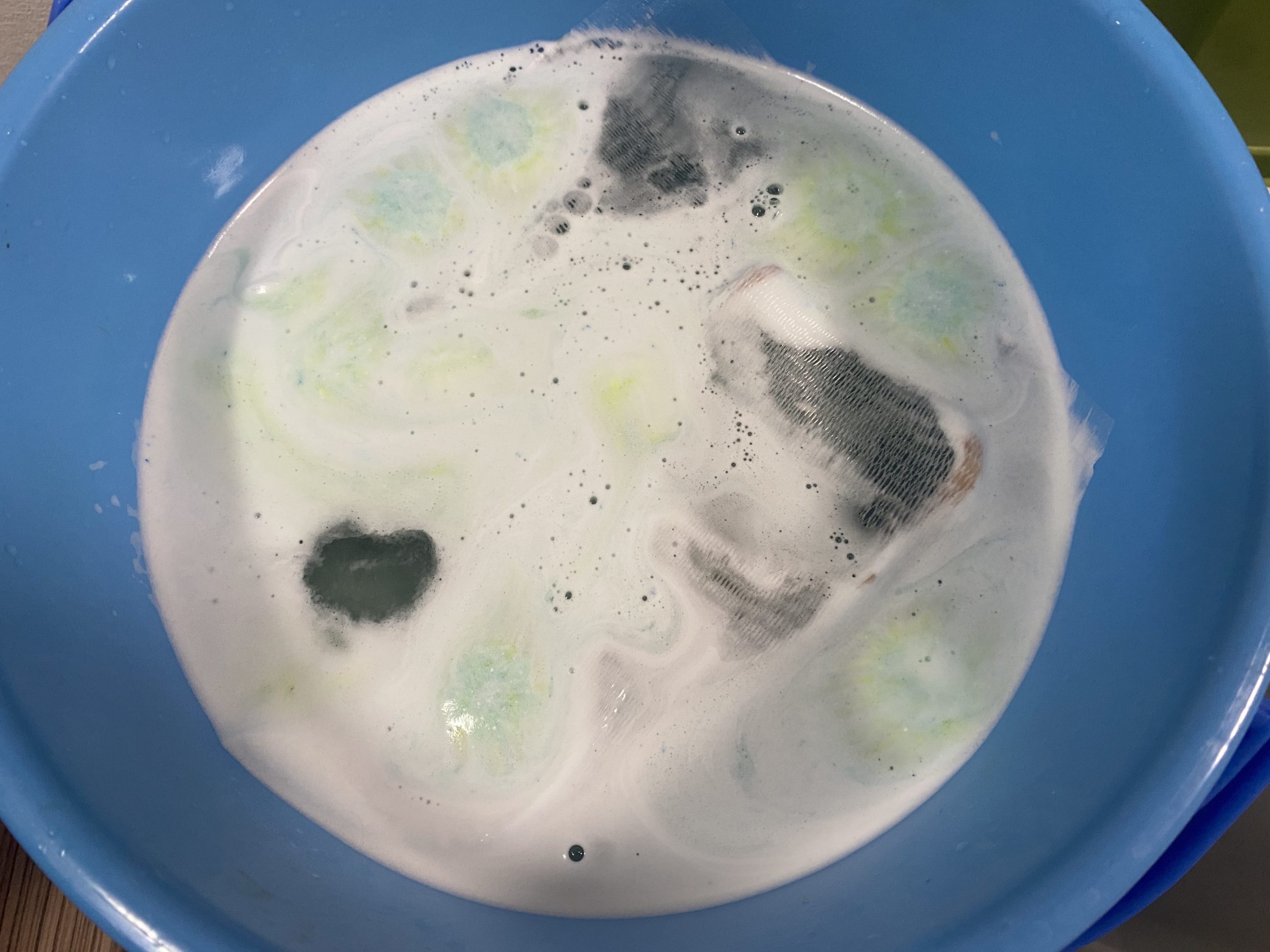 ポリデント漬けをしてある程度たったら、液を捨ててネットから取り出し、食器用洗剤と流水で一度きれいに洗浄します。