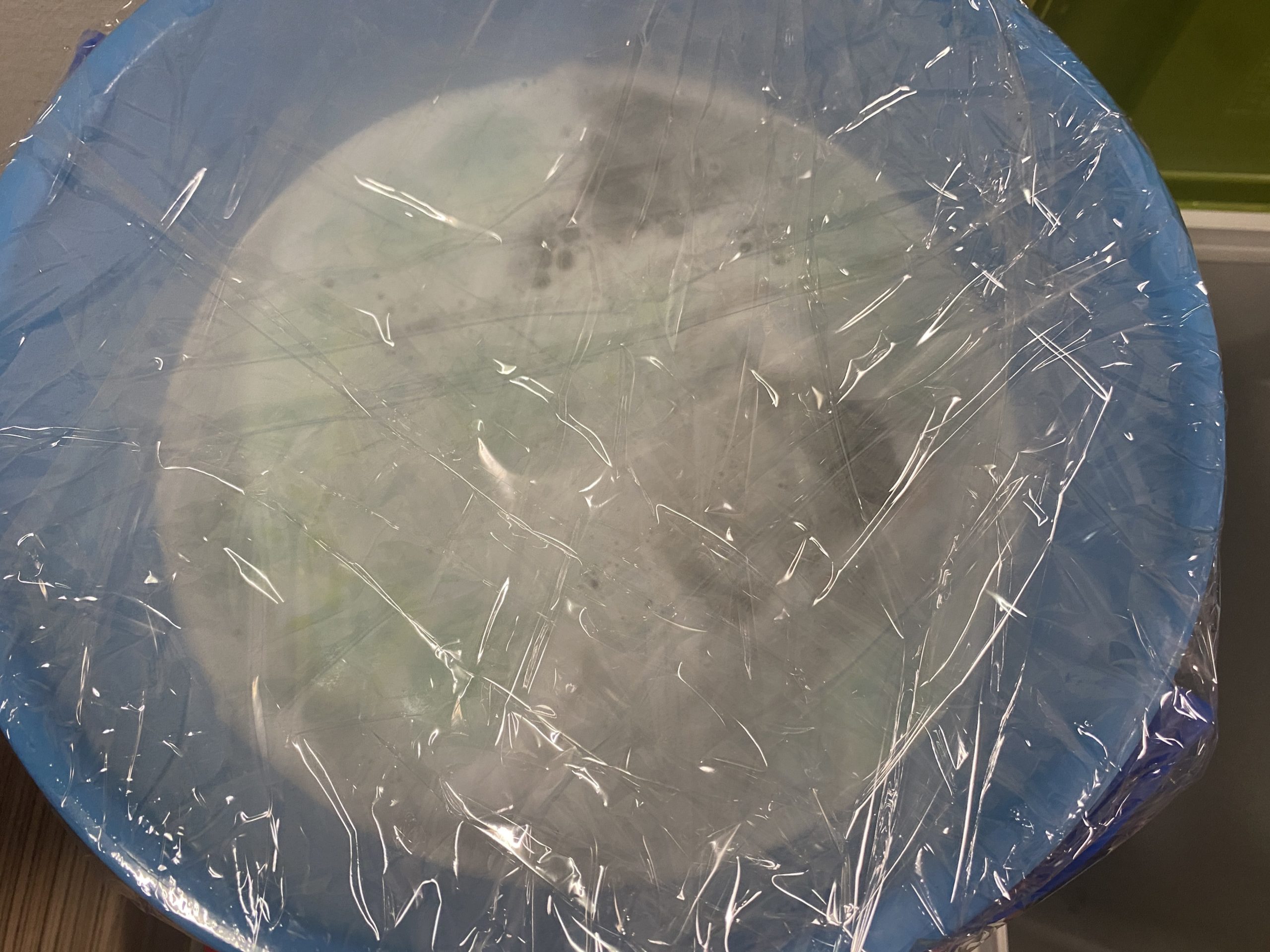 ポリデントのさわやかな香りが広がる…のは最初だけで、このあと何日も漬けている間に溶けたタンパクなどの独特な臭いがします。そこで、ラップでフタをすると臭いの拡散防止と液の蒸発防止になります。